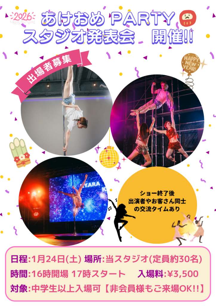 2026年1月24日(土) 当スタジオにてあけおめパーティー(ソロポールダンスショー)を開催します☺️ 当日はスタジオに観客を招いて開催します😊 このポールダンスショーは、当スタジオの会員様でなくても 誰でも見にきて頂けます😍 ポールダンス見てみたい方、知り合いが出るから見てみたい! などなど、、沢山の人に観てもらいたいと思っています✨ スタジオのキャパの関係で定員は約30名を予定 しております🙇♀️早い者順になりますので 見にこられる方は、人数把握したい為 代表者様のお名前と人数をDMしてくださいませ🙇♀️ 当日スタジオオーナーの @chiemi_pole も初めて スタジオでショーをさせて頂く予定でございます🥰